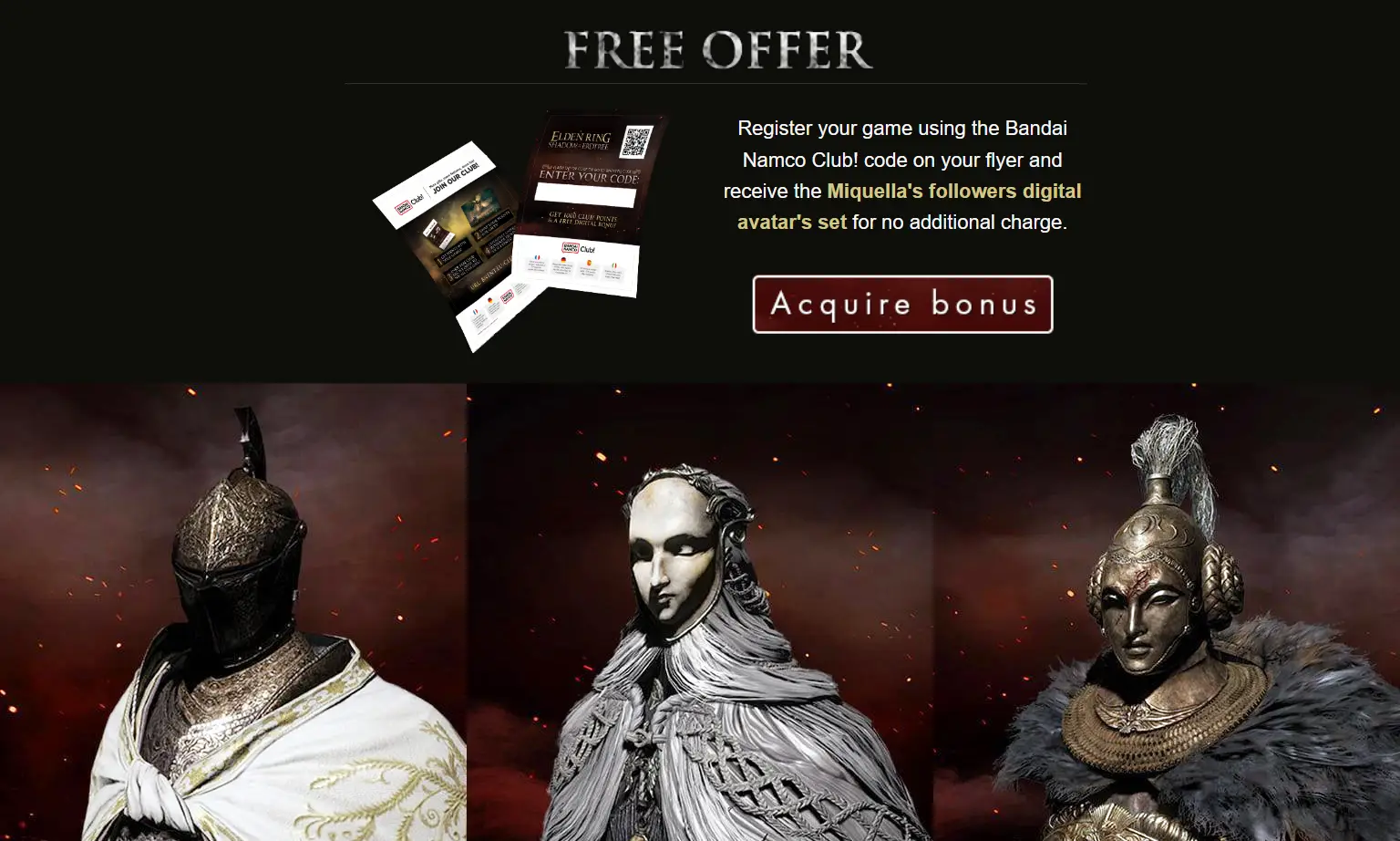 By registering your copy of Elden Ring: Shadow of the Erdtree on Bandai Namco Club with the code found on the flyer of physical copies, you can claim three avatars featuring the followers of Miquella. I’m not sure how these are claimed with digital purchases, but hopefully, you’ll receive an email once you’ve played the expansion on your platform of choice with an internet connection.