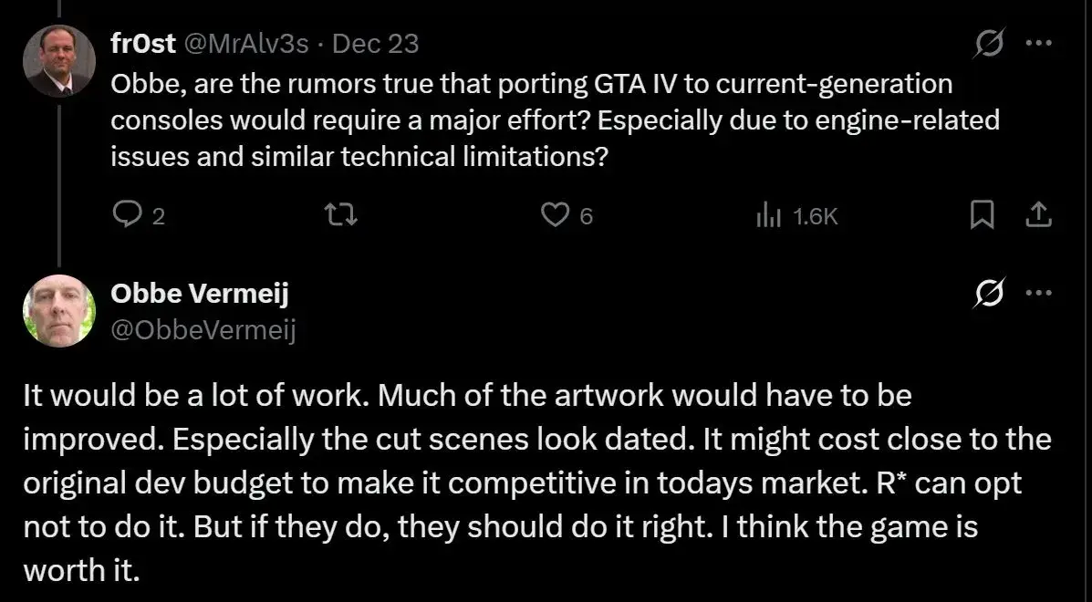 Back in December, one user asked Vermeij the following question: “Obbe, are the rumours true that porting GTA IV to current-generation consoles would require a major effort? Especially due to engine-related issues and similar technical limitations?”