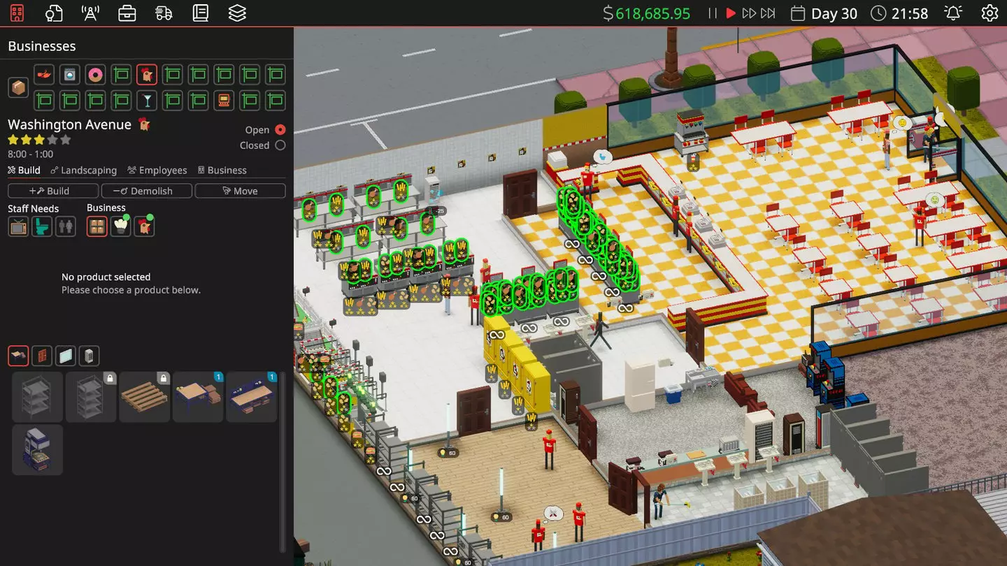 You’ll need to build up and manage these fronts, which includes selling legal goods to avoid detection. Although it starts off with fried chicken stores, you can diversify your portfolio and open up a whole manner of other new businesses.