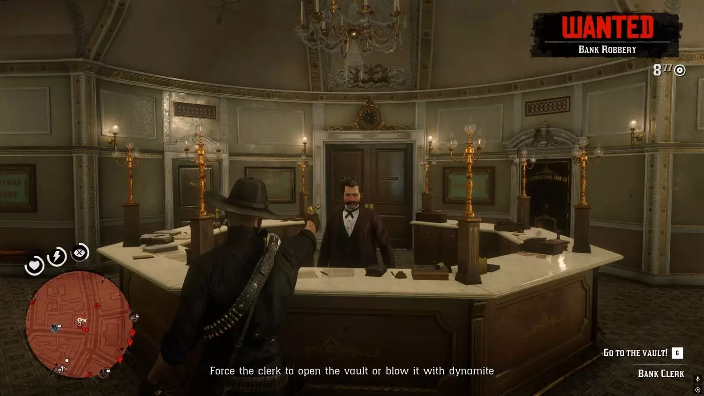 The teller will take you to the safes in the back where you can start making a withdrawal. You can either force the teller to open the safe, or use dynamite to blow open the door.