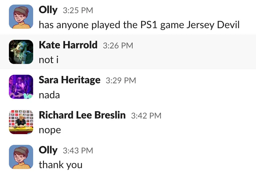 Naturally, my coworkers had not played it. Because why would they have played it? This game was pretty obscure even in 1997. It got an average critical score of 59%, and clearly didn’t sell enough because I can’t even find any public sales data for it.