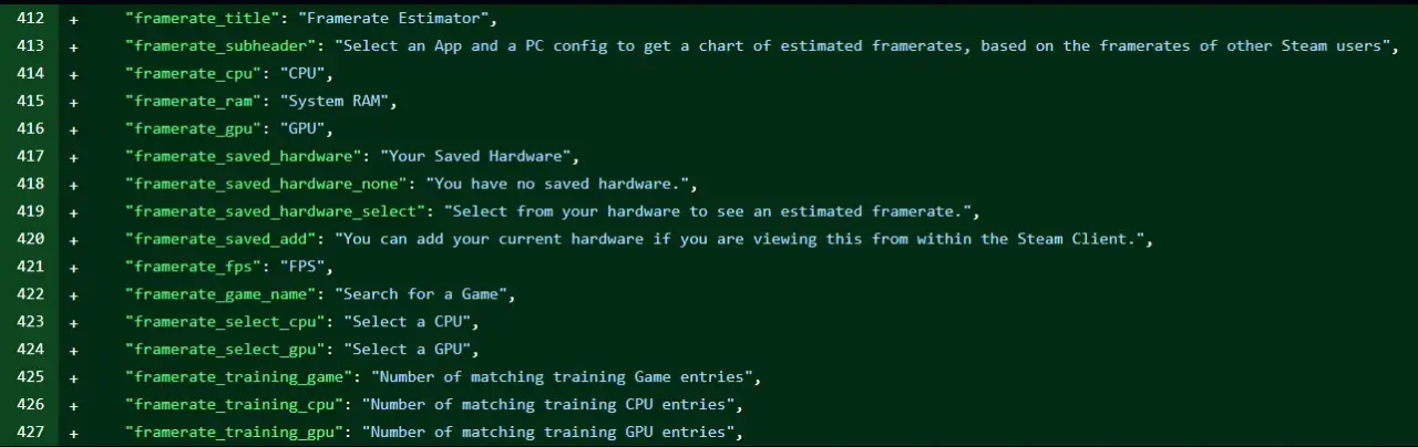 Dex3108 shares an image showing some of the new strings that have appeared, with an entry labelled as “Framerate Estimator” appearing at the top. This is followed by a subhead which says “Select an App and a PC config to get a chart of estimated framerates, based on the framerates of other Steam users.”