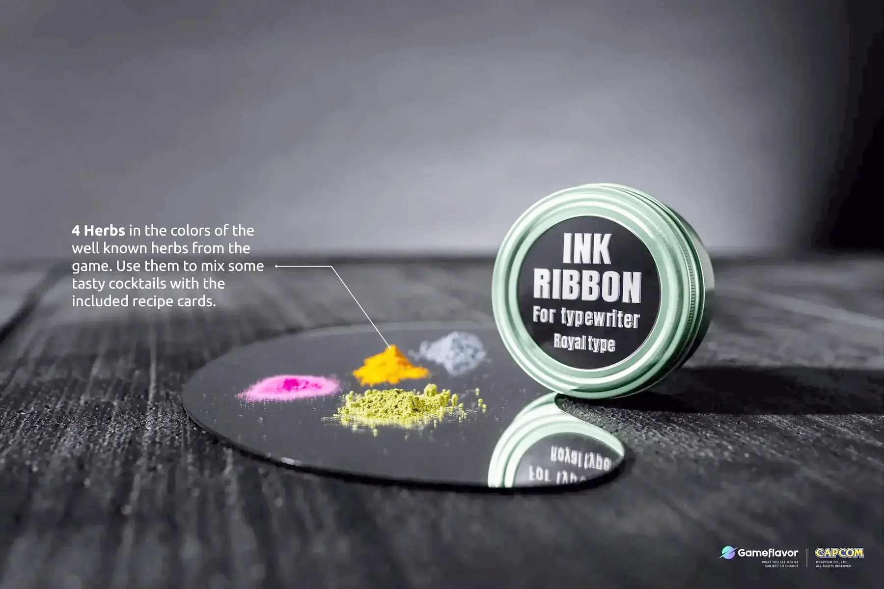 You get a total of four Ink Ribbon tins that once again replicate the in-game counterparts. But rather than using these Ink Ribbons to save your progress on a typewriter, each contains colours inspired by the herbs found in the Resident Evil series namely Hibiscus (red), Green Matcha (green), Turmeric (yellow) and Aronia (blue). The tins look fantastic and the herbs smell lovely. Yet, you must be careful when opening the tins. Not only is it easy to spill some of the herbs if not careful but the tins are a bit weak and easily dented. So, try not to be heavy-handed as it can jam the lid when twisting it off.